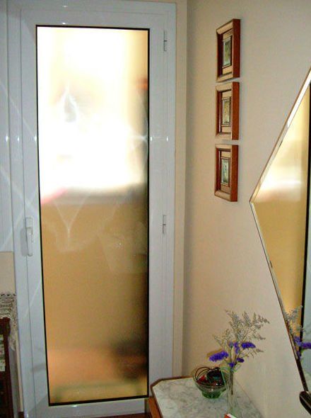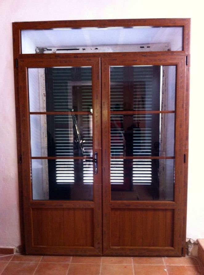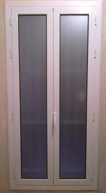 Puerta de dos hojas practicables con tapa de registro para persiana, en aluminio